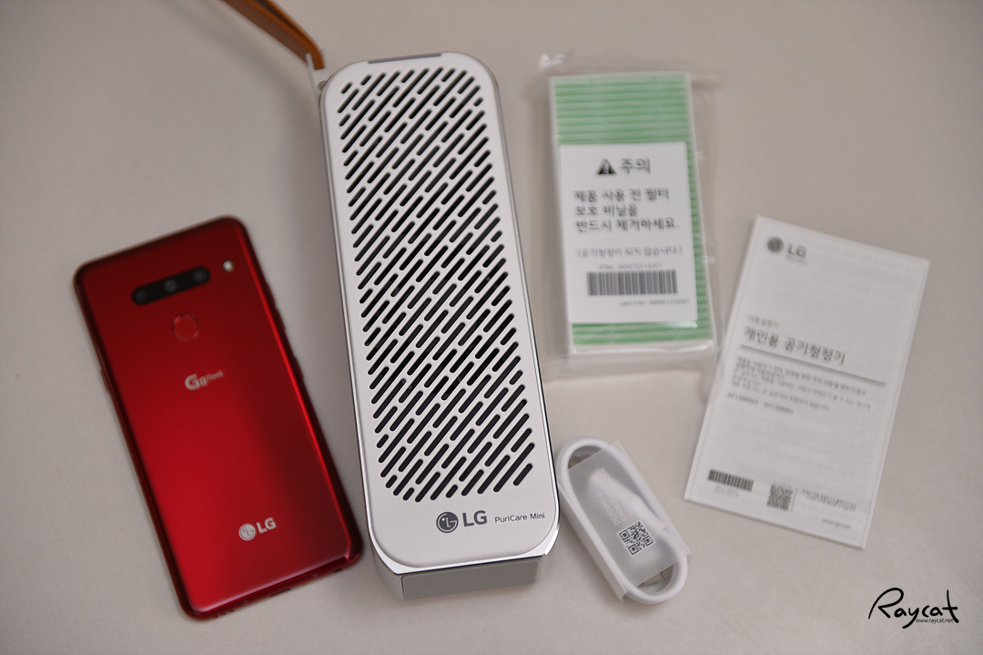 구성품을 모두 모아보면 위 사진처럼 구성이 되어 있습니다. 제가 가지고 있는 LG 스마트폰과 비교해 보면 LG 퓨리케어 미니 공기청정기의 크기는 짐작 되실 것 같습니다. 쉽게 생각하면 500ml 생수병 크기를 생각하셔도 좋습니다. 한 손에 쏙 들어오는 크기입니다.