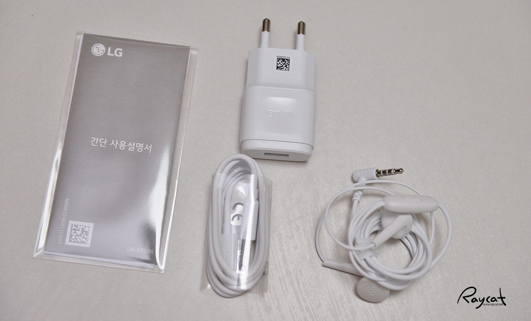 단말기외 다른 구성품을 보면 전원 충전 케이블, 어댑터, 이어폰, 간단 사용 설명서가 있습니다.