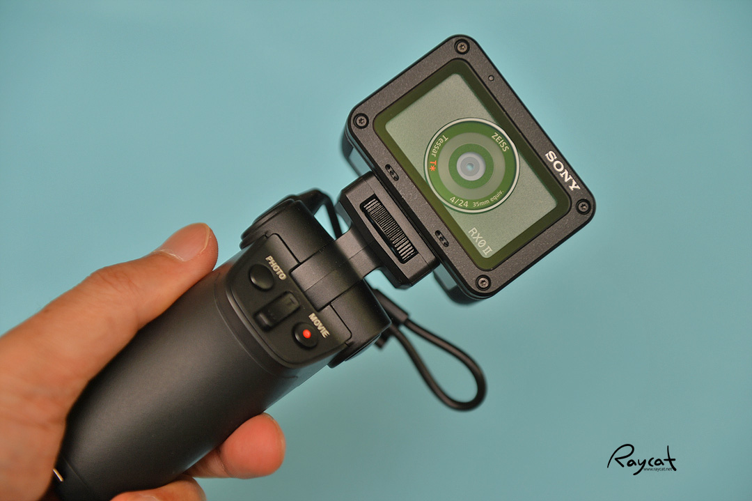 핸드 그립은 rx100과 호환이 되며 사진과 무비 버튼 그리고 줌 버튼이 있습니다. rx0 ii의 경우 24mm 고정 화각이라 줌 기능이 없는데 핸드그립의 줌 버튼을 사용하면 1.5배까지 확대해서 녹화됩니다.