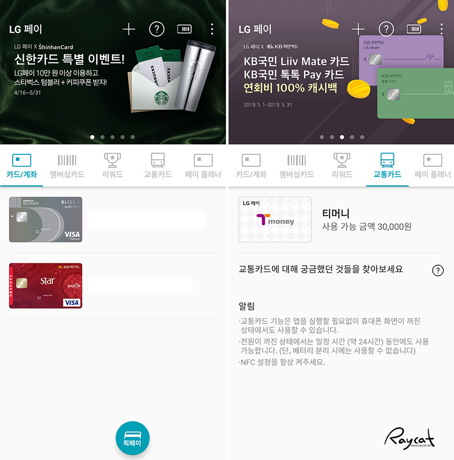 LG 페이는 제가 개인적으로 매일 사용하는 기능이 아닐까 싶은데 교통카드, 신용카드를 등록해 사용할 수 있으며 지갑을 들고나가지 않아도 사실 걱정이 없기도 합니다.