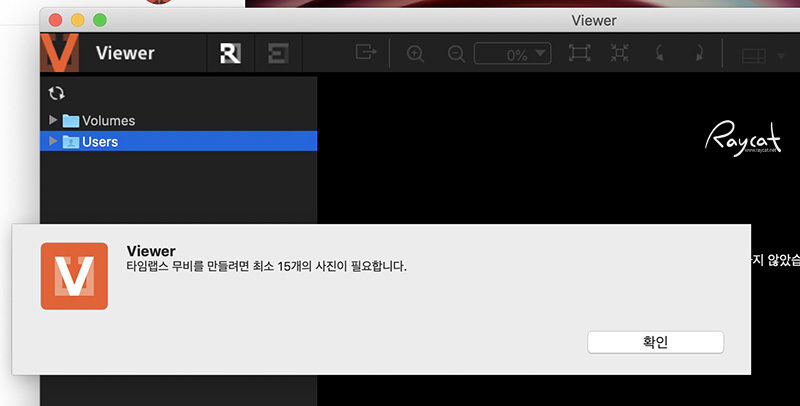 Viewer앱에서 15장 이상의 사진이 있다면 타임랩스 영상을 만들 수 있습니다.