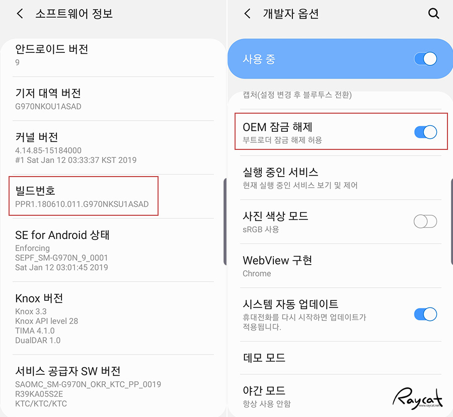 제 경우는 갤럭시 S10 개발자 옵션에서 OEM 잠금 해제를 설정해서 사용하고 있습니다.