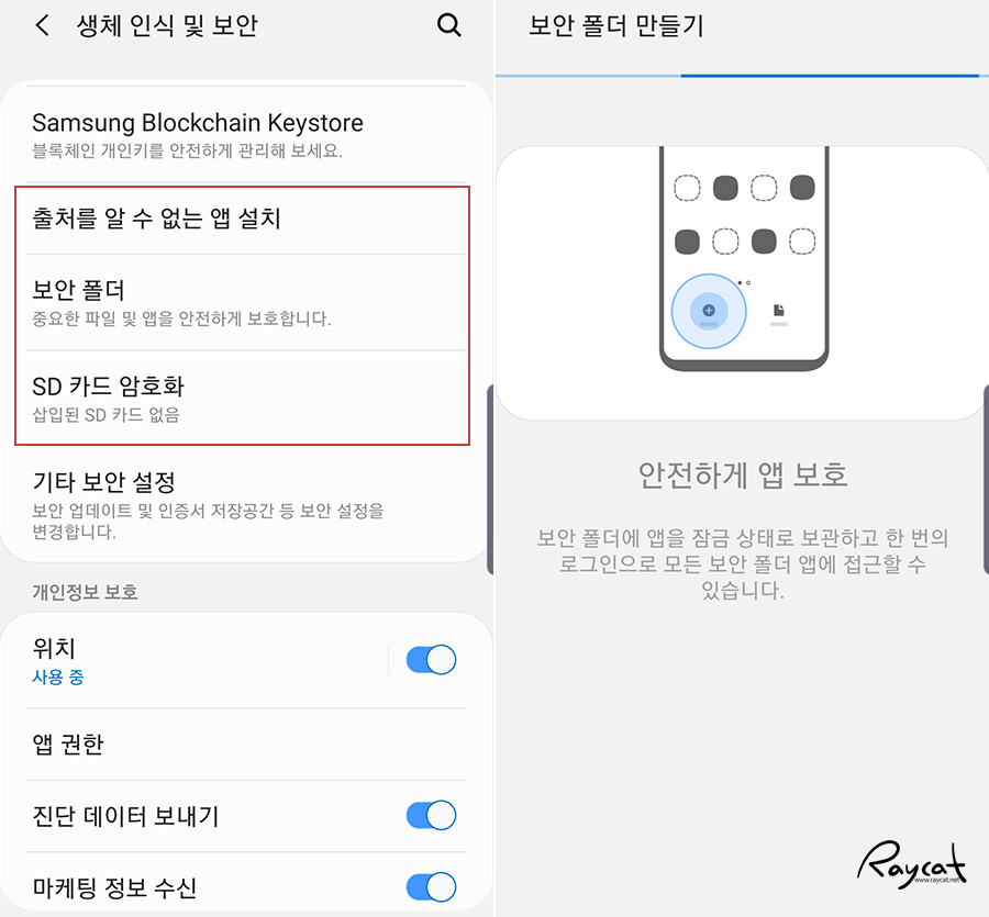 보안 폴더 생성은 설정 -> 생체 인식 및 보안에서 생성하고 관리할 수 있습니다.