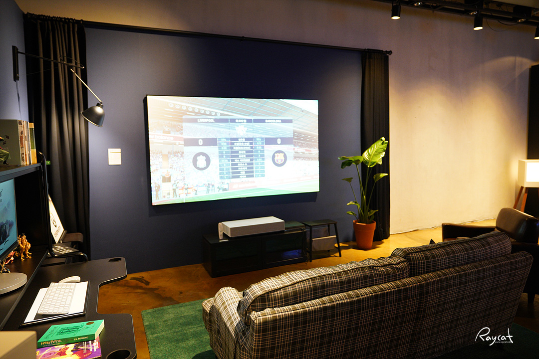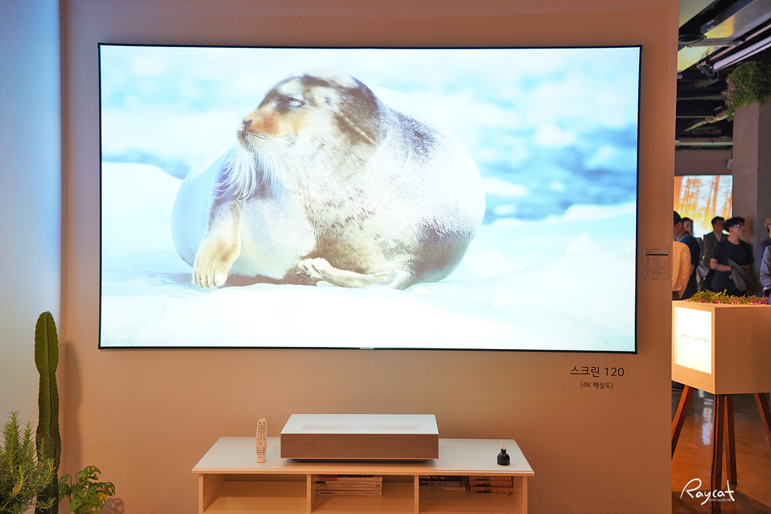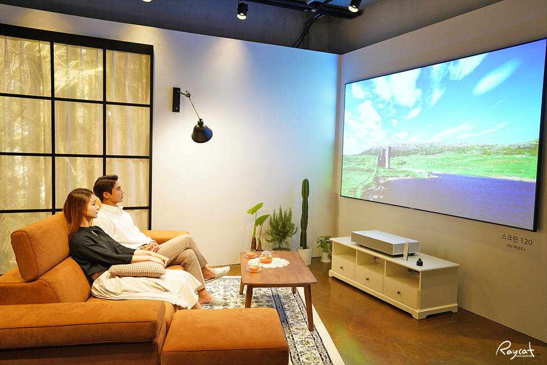 홈 시어터의 끝판왕이라고 할까요? 보통 요즘 가정에 놓이는 대형 TV가 60인치대임을 감안하면 120인치면 벽면 한쪽을 꽉 채우는 대형 스크린이 생기는 셈입니다.