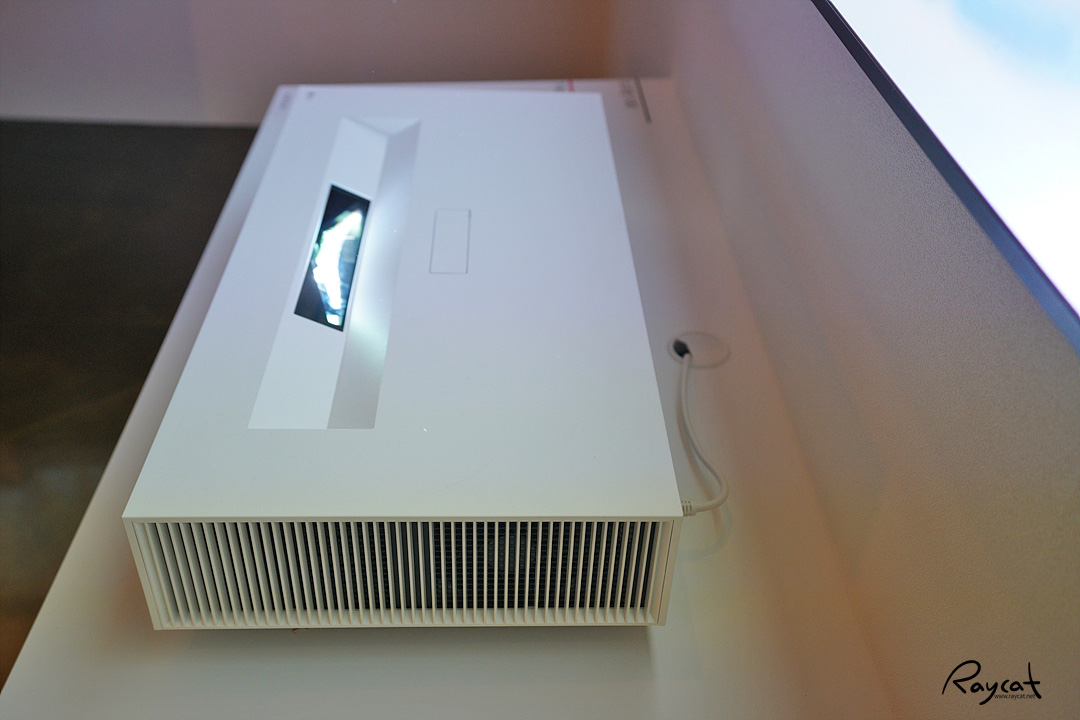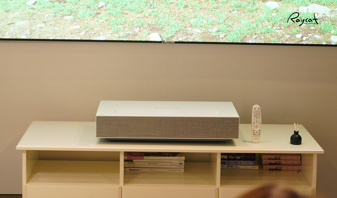 이 제품의 가장 큰 특징은 바로 초단초점으로 제품과 스크린의 간격이 10cm만 되도 100인치의 대화면을 4K 로 볼 수 있으며 최대 18.3cm의 거리에서는 120인치까지 지원합니다.