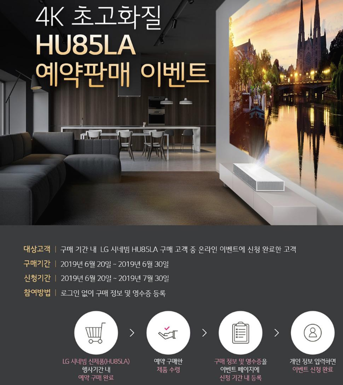 LG 시네빔 Laser 4K 신제품 HU85LA는 6월 20일부터 30일까지 50대 한정 예약 판매가 진행되며 이 기간에 예약 구매를 하신 50분에게는 프라엘 4종 풀세트 혹은 LG 퓨리케어 360도 공기청정기를 증정 받으실 수 있습니다. 선물이 좀 푸짐하네요. :)