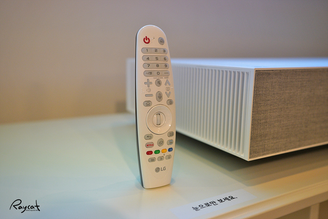 이 날 행사장에서 본 리모컨 처음에 tv 리모컨인줄 알았는데 LG 올레드 tv와 같은 형태의 리모컨이지만 이번 ‘LG 시네빔 Laser 4K’ 전용 리모컨으로 리모컨의 마이크로 음성인식이 가능해 음성인식 명령을 사용할 수 있습니다.