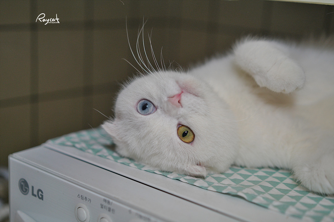 좀 특이하지만 일월의 경우 접힌 귀 그리고 오드아이라는 특이한 유전자를 다 가지고 나왔는데 둘다 돌연변이 유전자 입니다. 하얀털에 오드아이의 경우 난청이 올 수 있습니다.