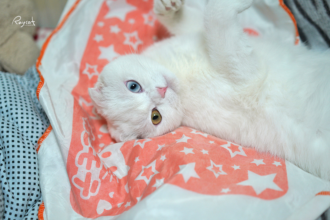 좀 특이하지만 일월의 경우 접힌 귀 그리고 오드아이라는 특이한 유전자를 다 가지고 나왔는데 둘다 돌연변이 유전자 입니다. 하얀털에 오드아이의 경우 난청이 올 수 있습니다.
