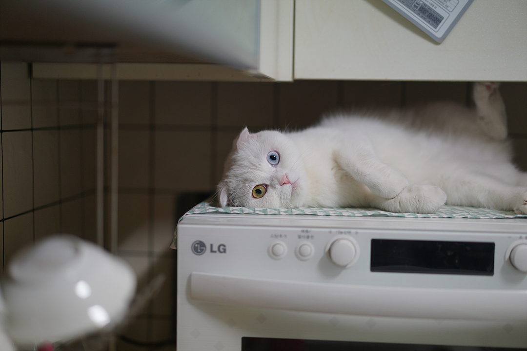 단지 청력은 다른 고양이에 비해 조금 약한편 입니다. 예전에 야웅군은 제가 3층쯤 올라오면 제 발소리를 듣고 현관앞에서 크게 울고 있었는데 일월은 도어록을 누르고 문을 열면 방에서 뛰어나와 마중을 옵니다.