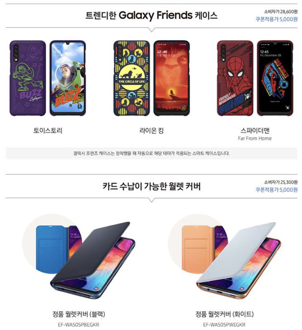 참고로 갤럭시 a50을 kt샵에서 구매할 경우 아래의 5종류 케이스 중 하나를 선택해 이벤트로 받을 수 있습니다. 케이스가 꽤 깔끔하고 마감이 이쁘게 보입니다.