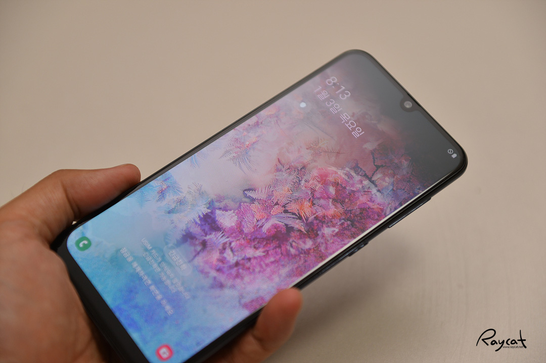 갤럭시 a50은 물방울 노치가 적용된 인피니티 U 디스플레이를 탑재했습니다. 이전에 잠깐 리뷰했던 갤럭시 진 2의 경우 같은 물방울 노치 디자인이지만 인피니티 V 디스플레이를 탑재했는데 노치 부분의 형태에 차이가 있습니다.