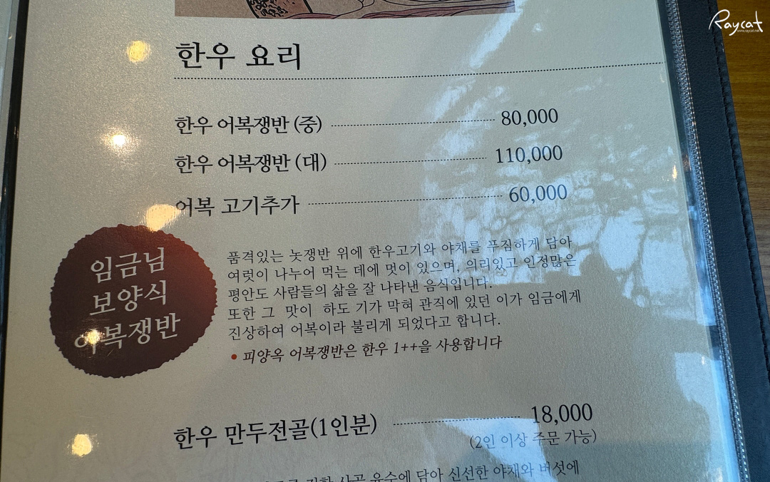 1++ 한우만 들어가서 그런지 가격은 저렴하지 않은 어복쟁반으로 중자와 대자로 나눠져 있으며 중자가 80,000원이다.