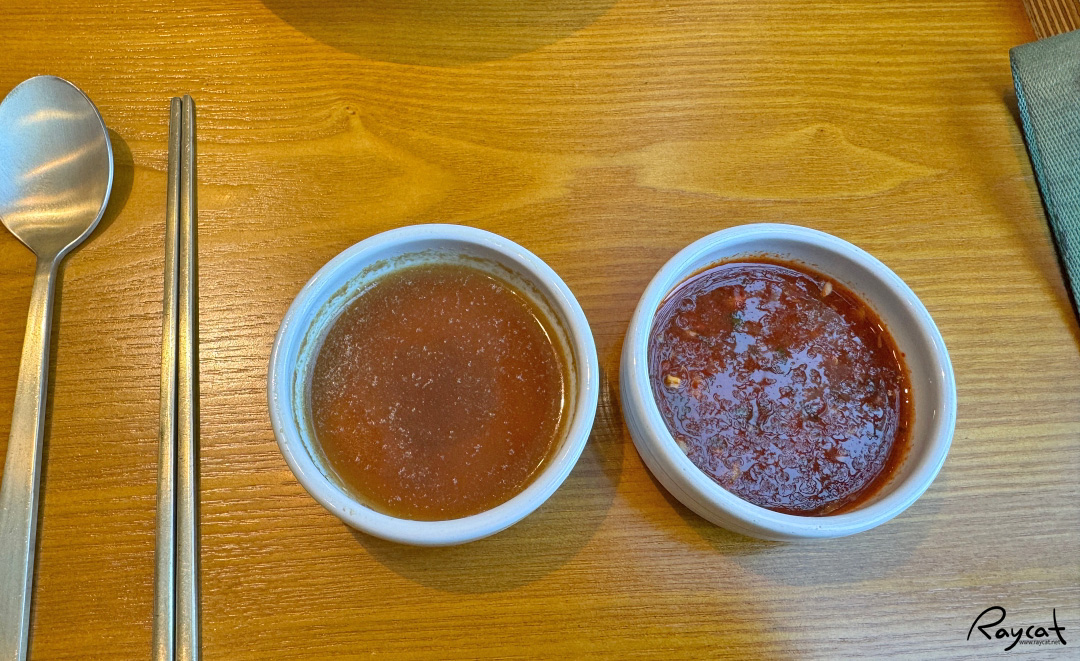 고기를 찍어먹는 양념장 2가지가 함께 나오는데 하나는 고소한 기름장이며 하나는 살짝 매콤한 맛의 양념장이다.