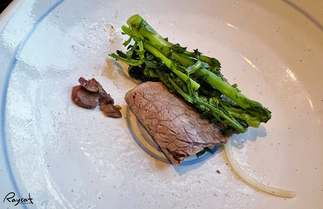고기를 들춰 올리면 아래쪽에 쑥갓, 콩나물등 채소류가 있으며 육수가 끓기 시작하면 고기와 함께 야채를 싸서 소스에 찍어 먹으면 된다.