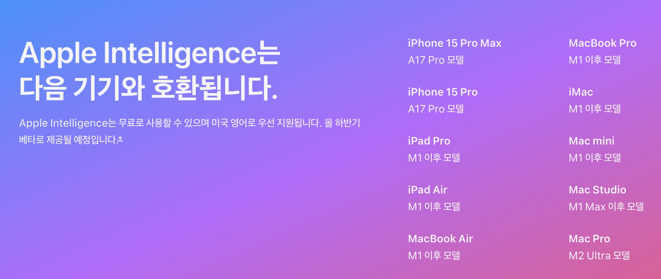 단 애플 AI인 애플 인텔리전스를 사용하기 위해서는 하드웨어 제약이 있는데 위에 보는 것처럼 애플실리콘 M 시리즈를 탑재한 아이패드와 맥 그리고 A17PRO를 탑재한 아이폰만 사용할 수 있습니다.