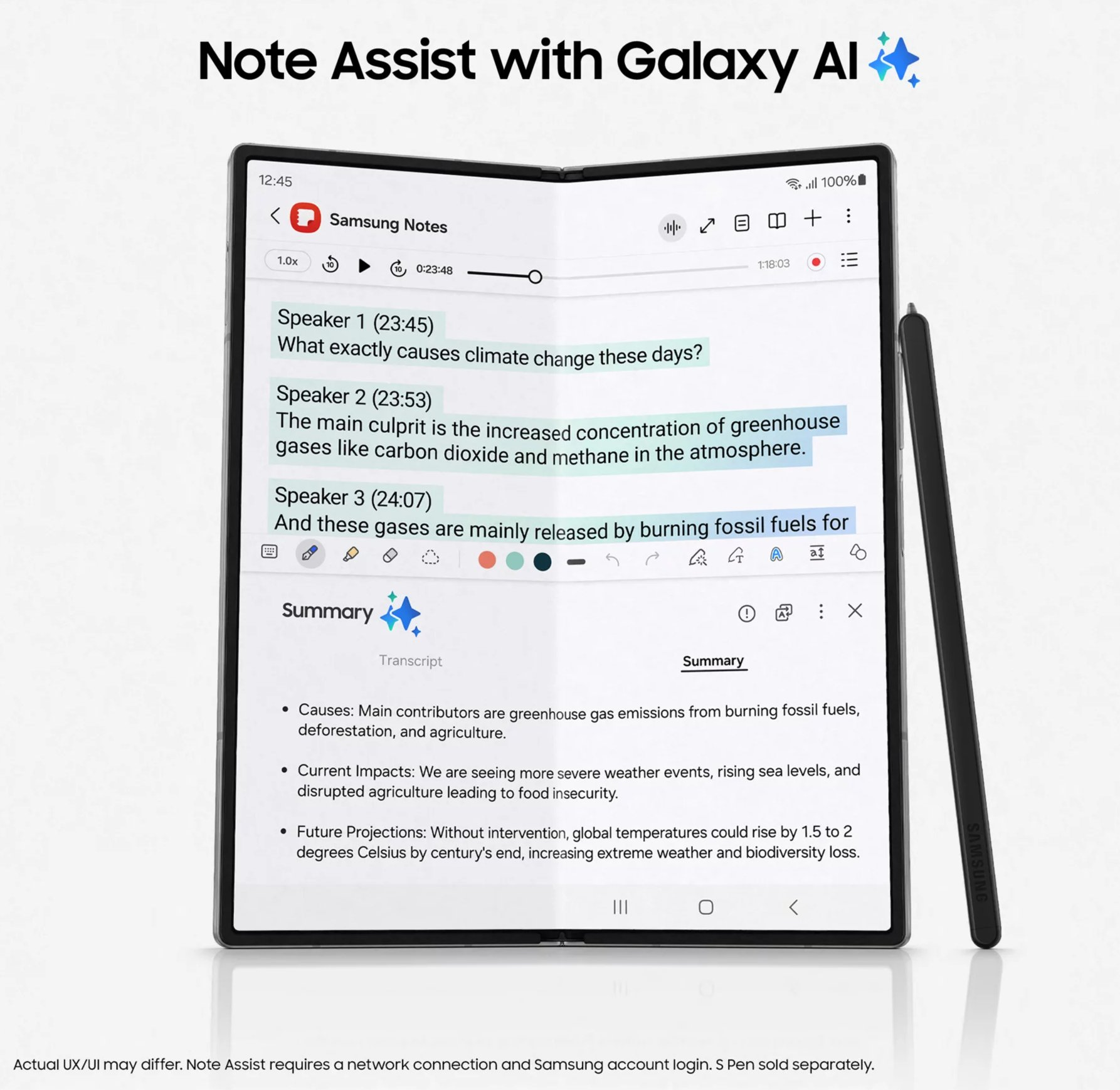 갤럭시 Z폴드6도 온디바이스 AI를 탑재 했으며 번역 기능 그리고 갤럭시 노트 기능을 보여주고 있는데 기존 갤럭시 S24 시리즈에 적용된 AI 기능과 같습니다.