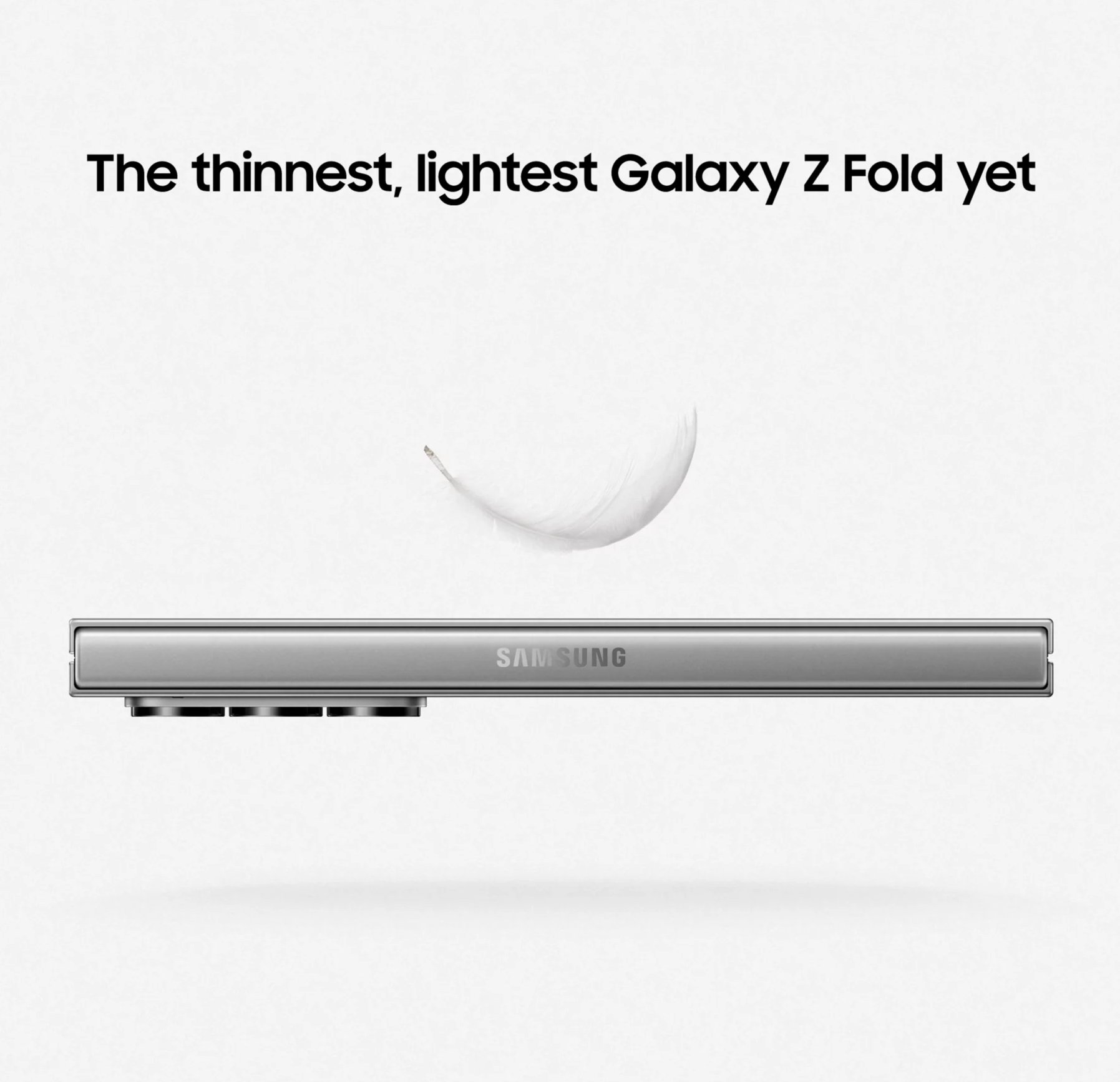 깃털 아래 갤럭시 Z폴드6의 이미지는 더 가벼워지고 얇아졌다는 의미를 보여주는것 같은데 힌지가 완전히 반으로 접혀 밀착되어 틈이 없음을 보여주는듯 합니다.