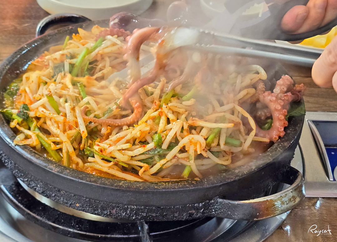 낙지찜을 주문하면 양념한 콩나물을 수북히 담은 돌판과 상차림을 해준다.
