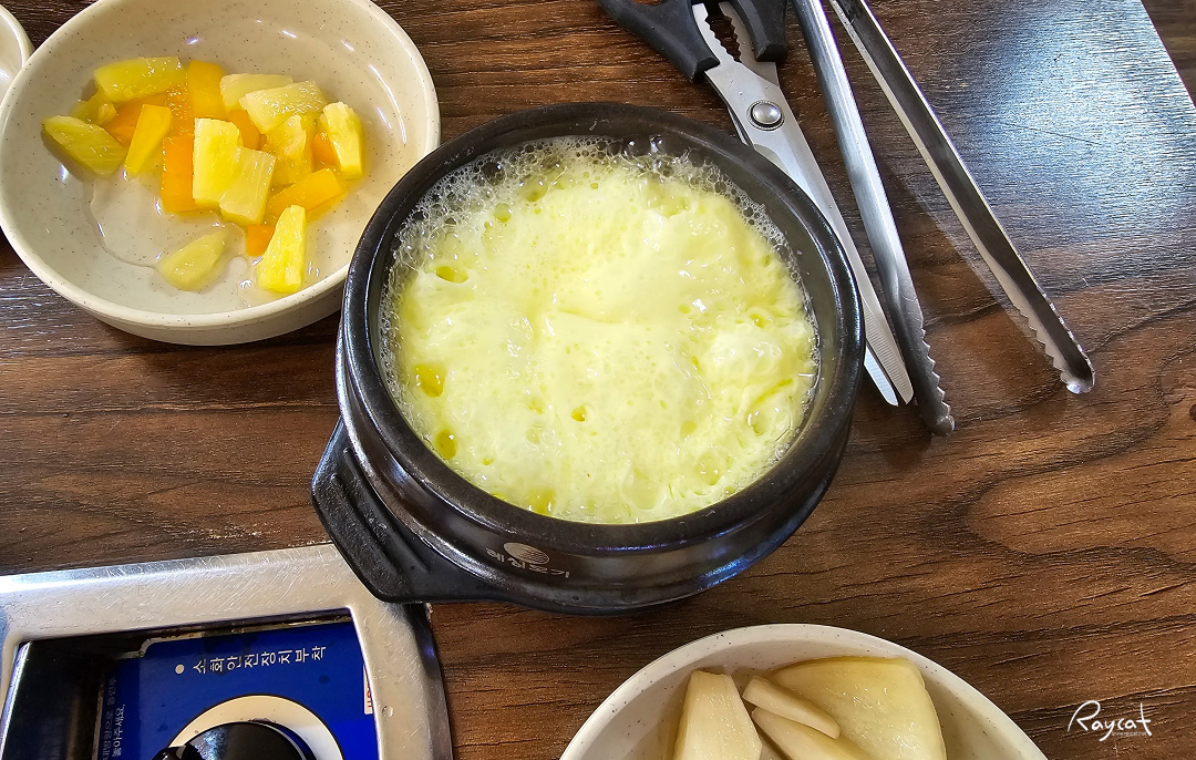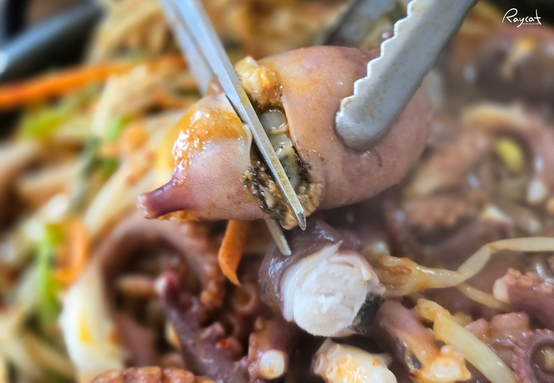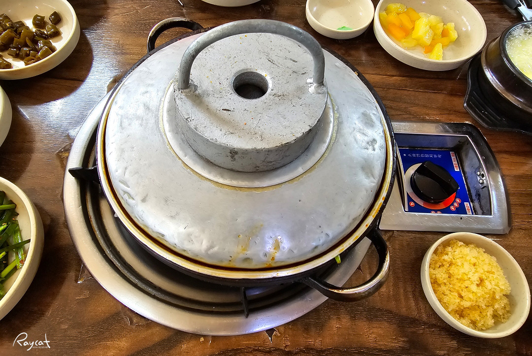 산낙지라서 뚜껑을 덮고 위에 무거운 쇠덩이를 올려주는데 산낙지라 돌판이 뜨거워지면 낙지가 움직여서 뚜껑을 열고 나오기 때문이다.