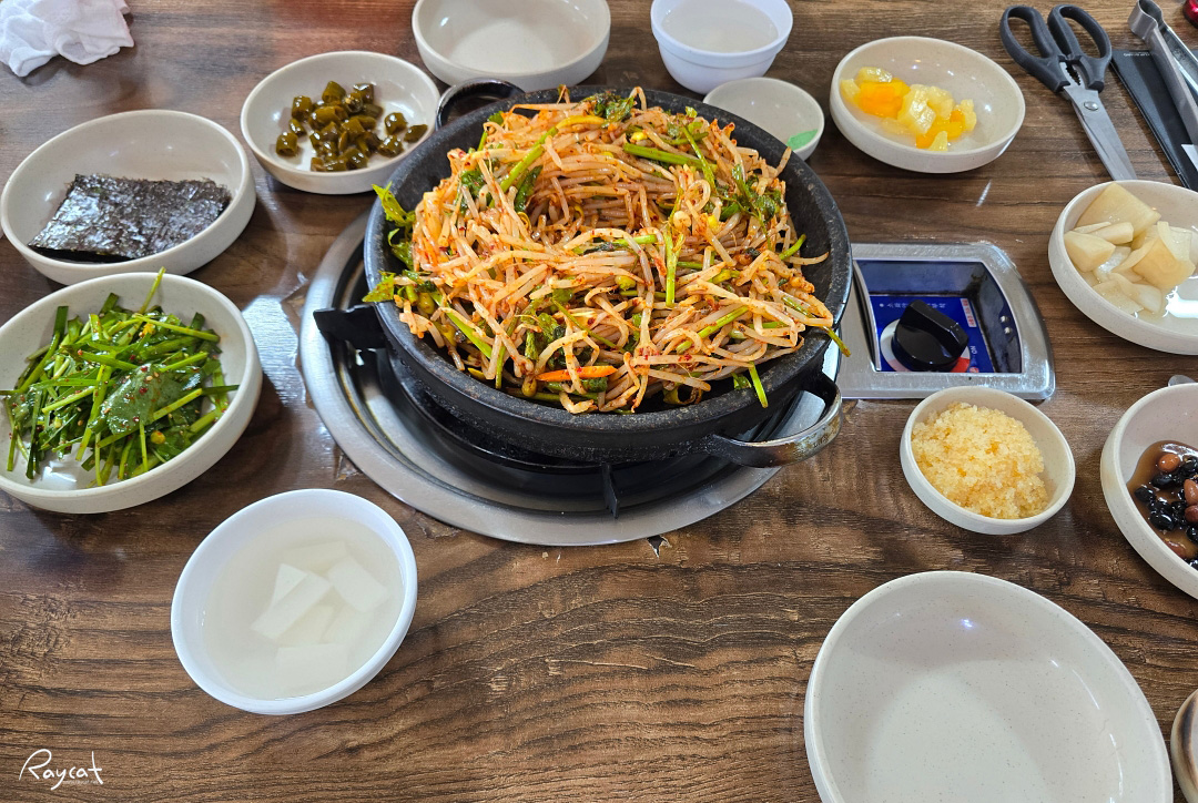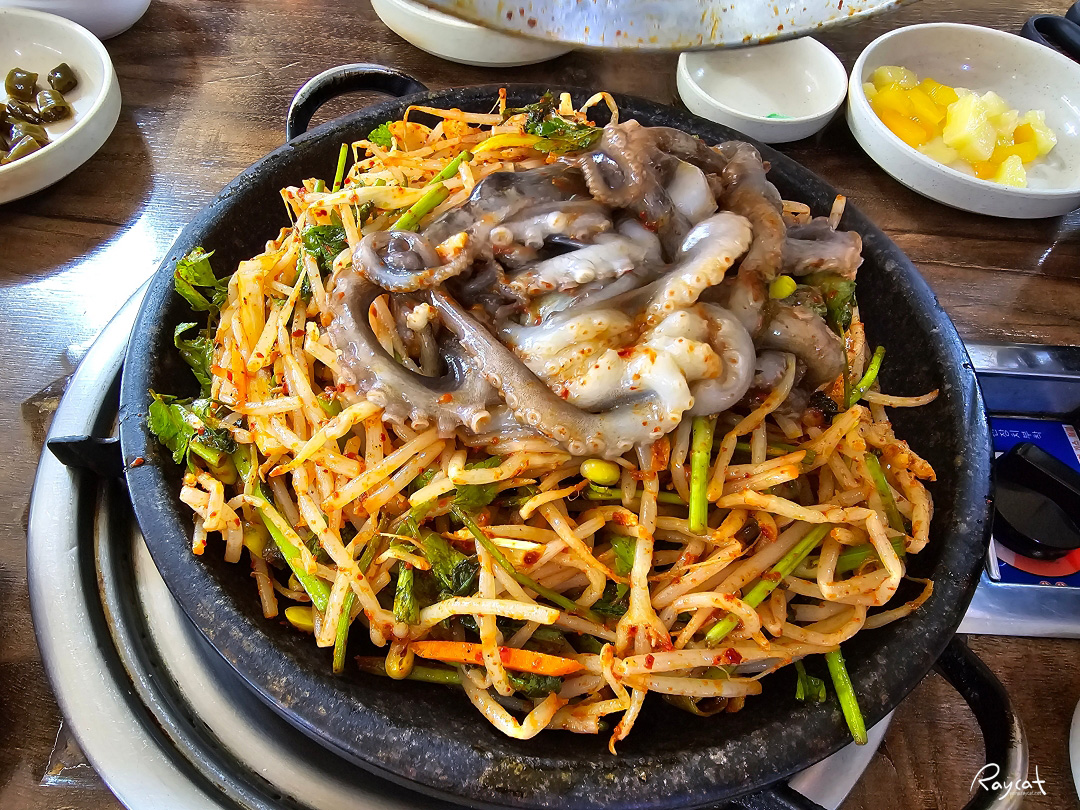 낙지찜을 주문하면 양념한 콩나물을 수북히 담은 돌판과 상차림을 해준다.