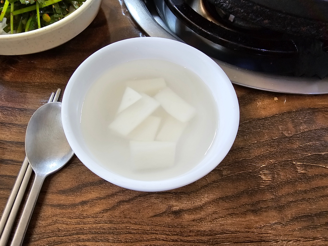 동치미가 나오는데 낙지찜을 매운맛으로 주문하면 입이 매울 때 한 숟가락씩 먹으면 맛있다.