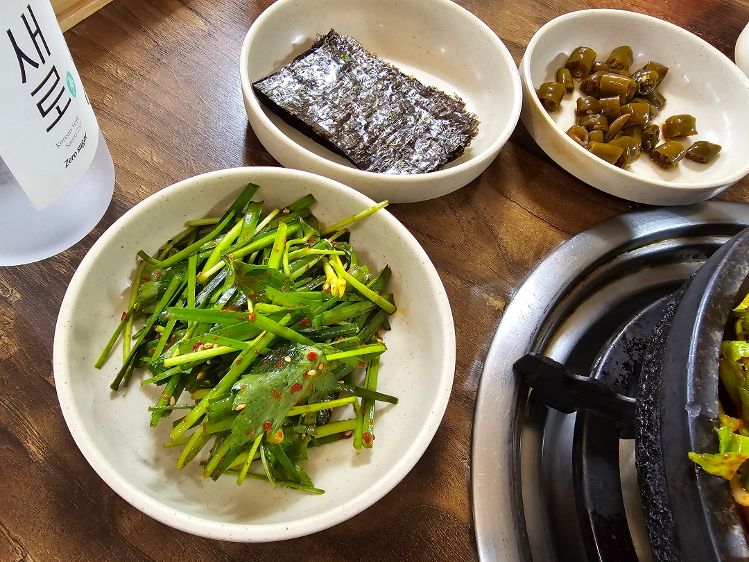 밑반찬이 다 맛있는데 부추와 김, 고추장아찌를 낙지찜과 함께 싸먹으면 더 맛있다.