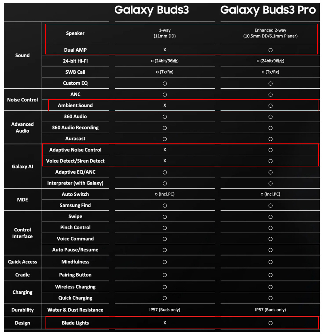 갤럭시 버즈3 프로에만 지원되는 기능을 보면 듀얼 AMP 탑재, 엠비언트 사운드, 어댑티브 노이즈 컨트롤, 대화 감지와 사이렌 감지도 갤럭시 버즈3 프로에만 적용된 기능이며 측면 블레이트 라이트 기능 역시 위에서 언급했듯 버즈3 프로에만 적용됩니다.