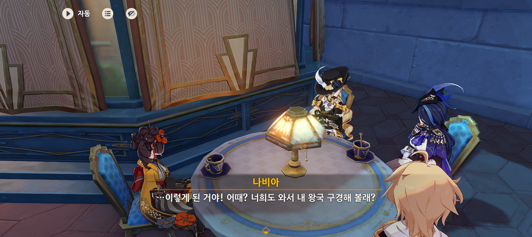 상호작용을 하면 대화를 볼 수 있는데 나비아가 시뮬랑카에서 있었던 일을 치오리와 클로린드에게 자랑하고 있습니다.