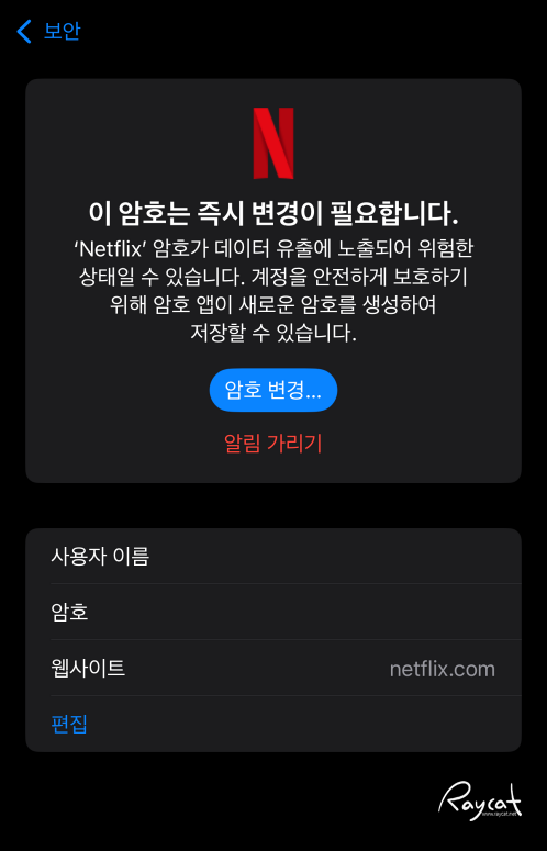 암호앱에서 유출된 사이트의 암호를 변경할 수 있으며 일단 유출된 비밀번호는 우선 다른 사람과 아이디를 공유하고 있는 앱이나 사이트의 경우 비밀번호가 유출된 것으로 판단하는 것 같습니다.