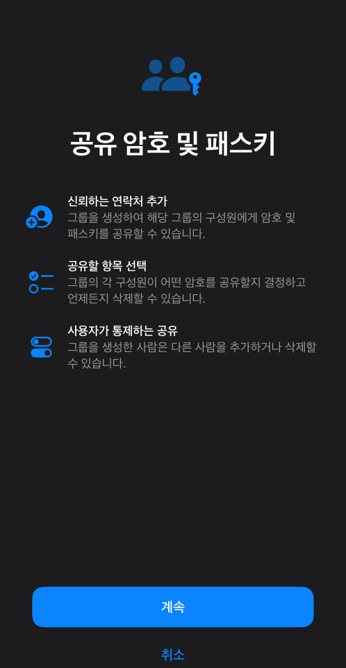 특정 사이트의 아이디와 비밀번호를 암호 앱을 통해 공유가 가능하며 개인 간 공유뿐 아니라 그룹을 만들어 공유도 가능해 회사 같은 곳은 인트라넷 서버를 관리하는 팀이라면 팀원끼리 그룹을 만들어 공유할 수 있습니다.
