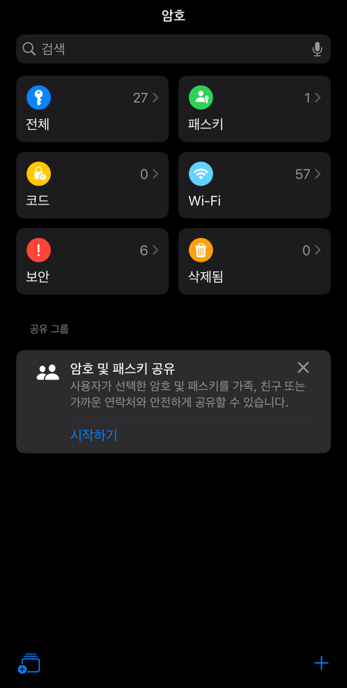 암호 앱을 실행해 오픈하면 6개의 큰 카테고리로 정보가 저장되어 있는 걸 확인할 수 있는데 전체 카테고리는 아이폰에 저장된 웹사이트나 앱의 전체 아이디와 비밀번호가 있으며 저장된 정보중 유출되었거나 위험요소가 감지되며 보안 항목에 들어가게 됩니다.