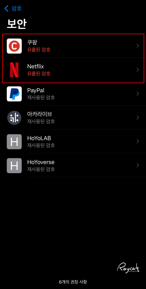 보안 항목에 보면 쿠팡과 넷플릭스가 유출된 암호로 경고가 나오고 있고 일부 사이트의 암호는 재사용된 암호로 나오는데 아마 쿠팡과 넷플릭스의 경우 제가 다른 사람과 아이디를 공유하고 있어서 유출된 암호로 나오는 것 같습니다.