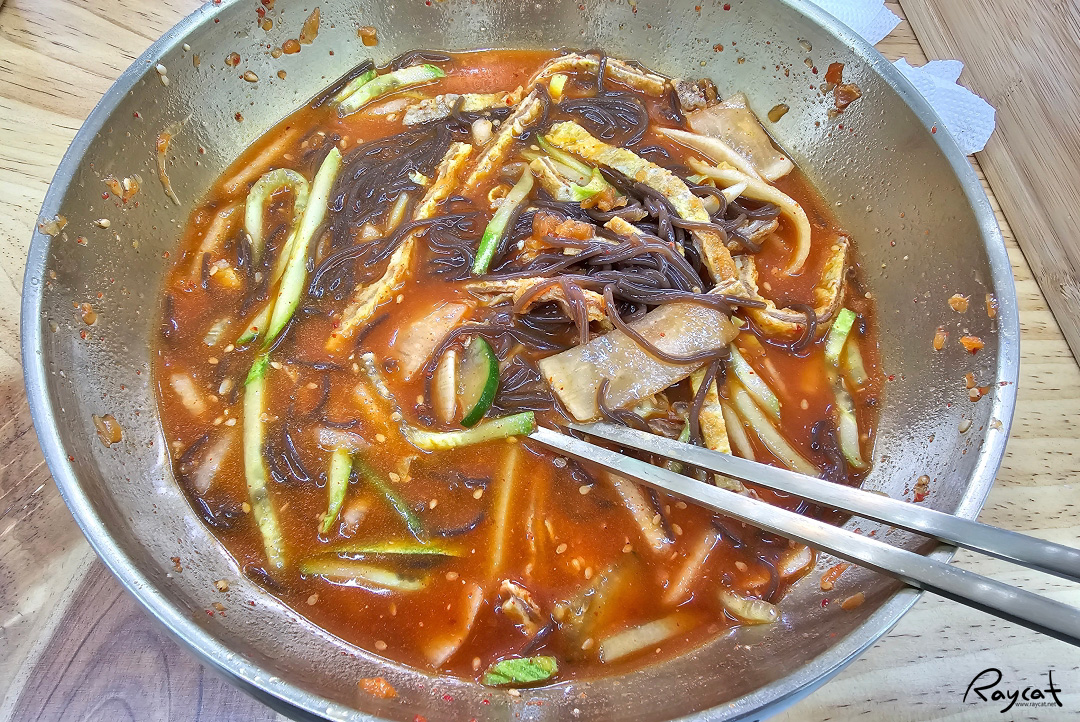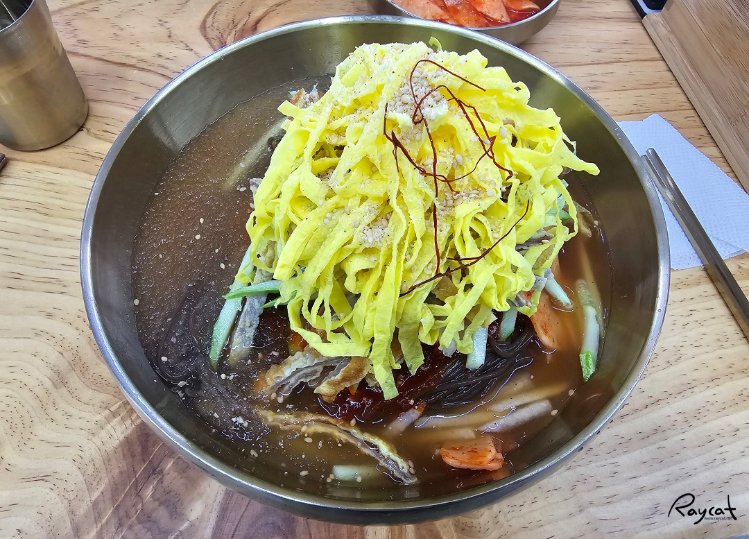 조금 어정쩡할 수도 있는데 보통 중국집의 짬짜면은 그릇이 반으로 나눠져 한쪽은 짜장면 한쪽은 짬뽕이 들어가 있지만 이건 그냥 섞여 있어서 물냉면 본래의 맛과도 다르고 비빔냉면 본래의 맛과도 다르다.