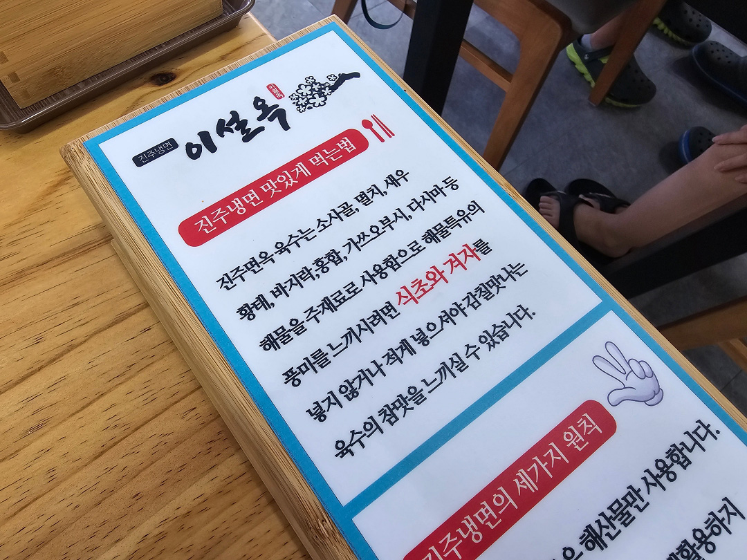 진주냉면을 맛있게 먹는 법이라고 탁자마다 안내판이 있는데 해물을 주로 사용하는 육수를 베이스로 만드는 것을 알 수 있는데 겨자와 식초를 넣지 말라고 되어있다.