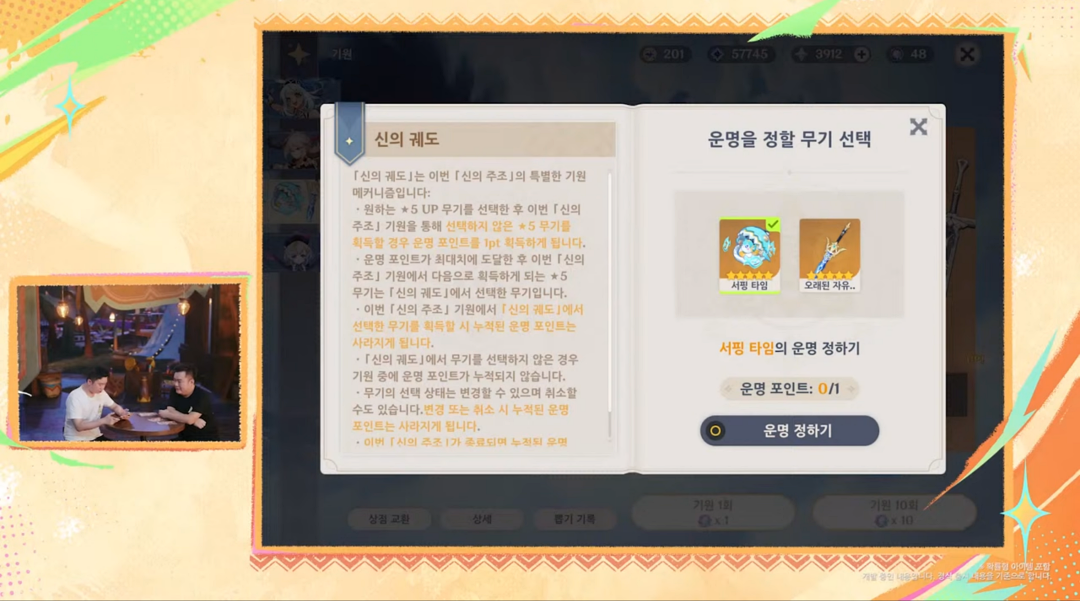 원신 무기 픽업의 경우 캐릭터 픽업 보다 더 많은 원석이 필요한데 이제 무기의 운명 포인트가 줄어서 픽뚫을 하면 그 다음에 확정으로 바로 픽업 무기를 획득할 수 있습니다. 무기 기원은 정말 잘 바꾼것 같습니다.