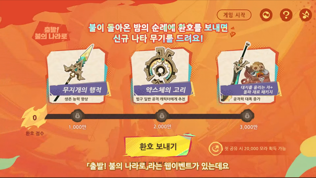 나타에는 신규 단조 무기 5종이 추가되는데 이번에 신규 단조 무기중 3종류는 웹이벤트에서 참여하면 신규 나타 단조무기 3종류는 획득할 수 있습니다. '출발! 불의 나라로' 웹이벤트는 호요랩 웹페이지에서 참여할 수 있습니다.
