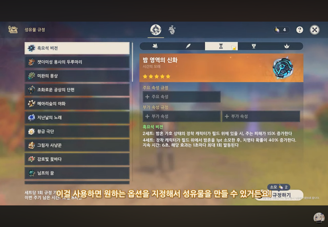 그리고 편의 시스템중 가장 아마 많은 유저들이 기다렸던 시스템이 아닐까 싶은데 성유물 옵션을 이제 변경할 수 있습니다.