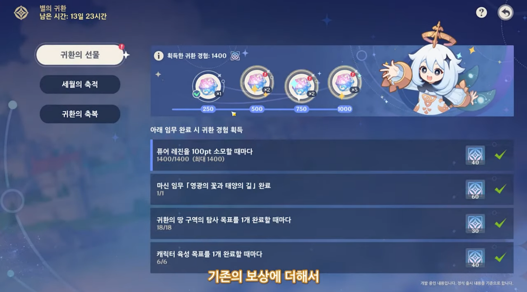 그리고 원신을 접었다가 복귀한 유저들을 위한 혜택도 업그레이드 되었는데 뒤얽힌 인연 10개가 추가 되었습니다.