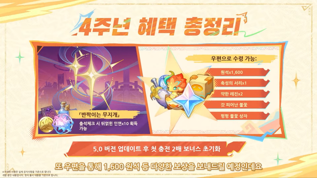 그리고 다음 달이면 원신 4주년이 되는데 4주년 혜택 보상은 아래와 같습니다.