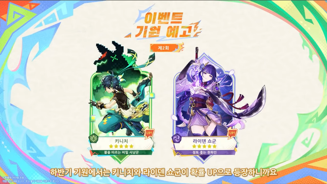 후반부 이벤트 기원에 키니치(풀원소), 라이덴 쇼군(번개)이 등장합니다.