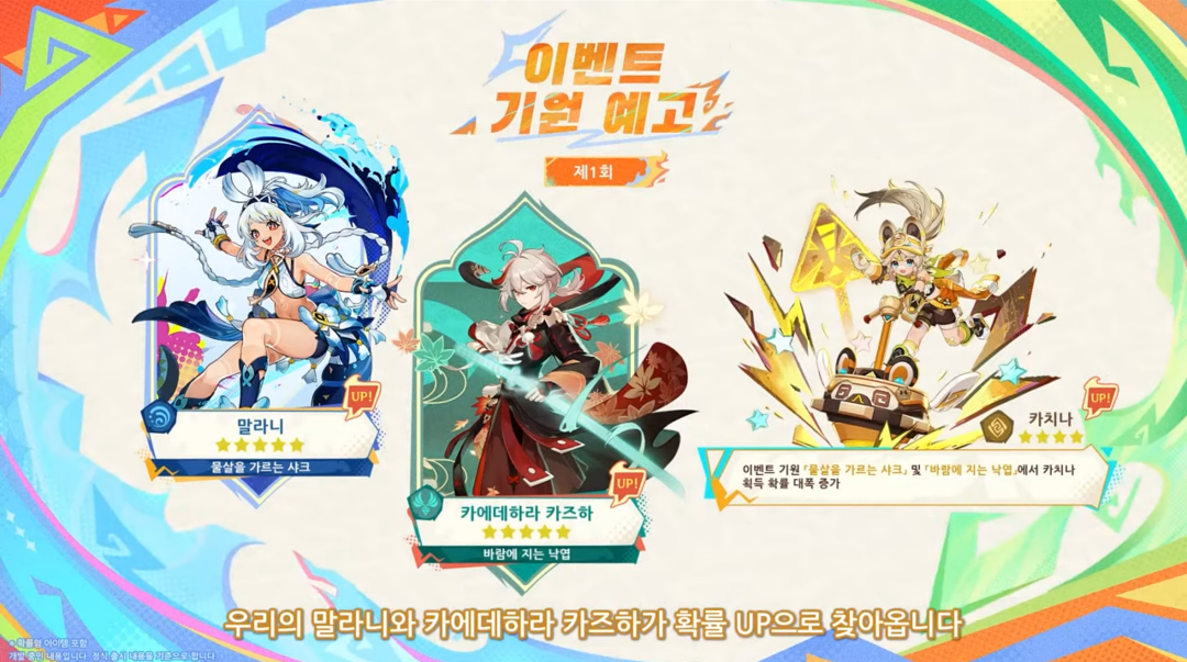 전반부 물원소 말라니, 카에데하라 카즈하, 바위원소 카치나가 캐릭터 기원에 등장합니다.