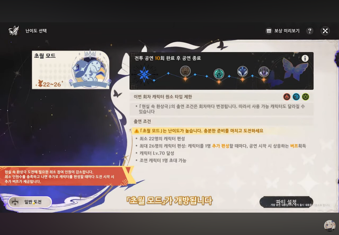 현실속 환상극 역시 시스템이 좀 바뀌며 원소 반응에 대한 명확한 설명과 시스템 알림이 추가되며 보상도 더 늘어나는데 초월 모드가 추가되며 난이도 더 올라갑니다.