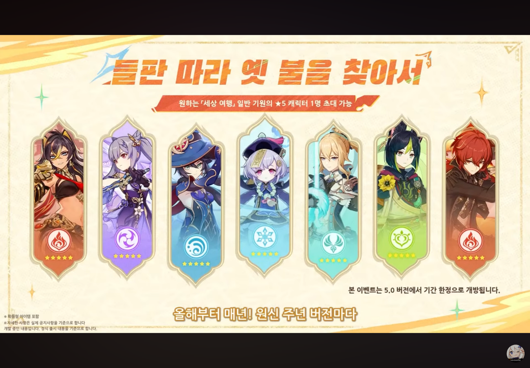 그리고 올해부터 원신 주년 버전마다 상시 5성 캐릭터를 하나 초대할 수 있습니다.