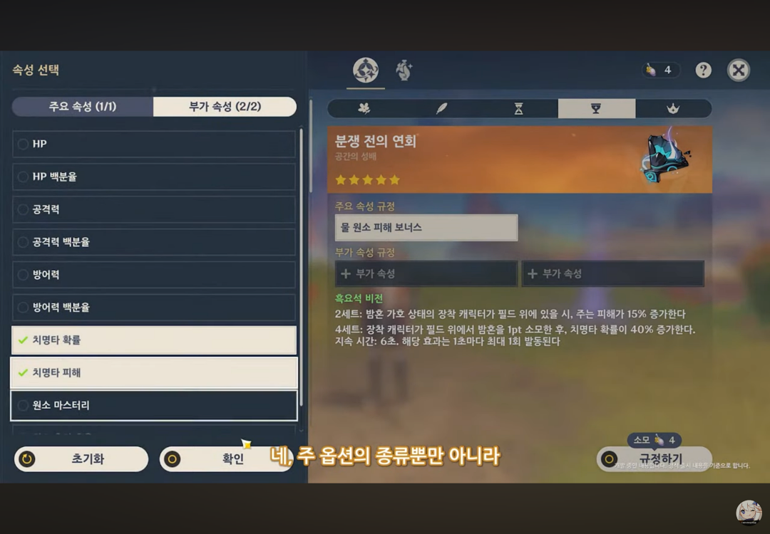 그리고 편의 시스템중 가장 아마 많은 유저들이 기다렸던 시스템이 아닐까 싶은데 성유물 옵션을 이제 변경할 수 있습니다.
