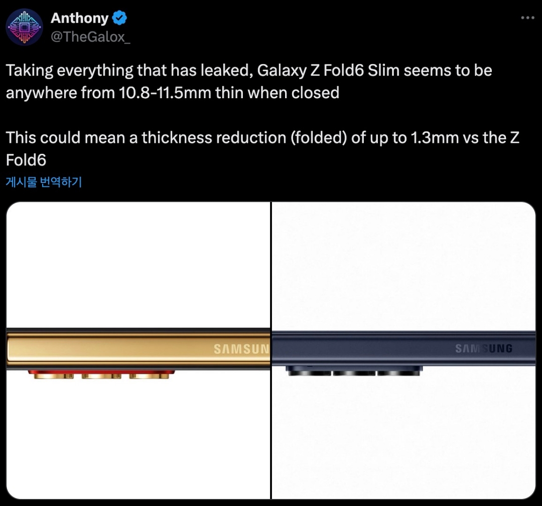 현재 알려진 내용을 보면 갤럭시 Z 폴드6 슬림(Galaxy Z Fold6 Slim)은 닫았을 때 두께가 10.8~11.5mm 정도로 예상되며 기존 갤럭시 Z 폴드6의 경우 12.1mm로 슬림 버전의 경우 최대 1.3mm 정도 두께가 얇아질 거라 예측하고 있습니다.