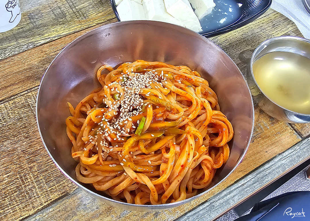 칼비빔국수에 오이, 통깨를 뿌려서 나올뿐 사실 국수에 들어가는 다른 고명은 없는 평범한 국수인데 칼국수면을 사용하고 양념 소스가 맛이 괜찮은 집이다.
