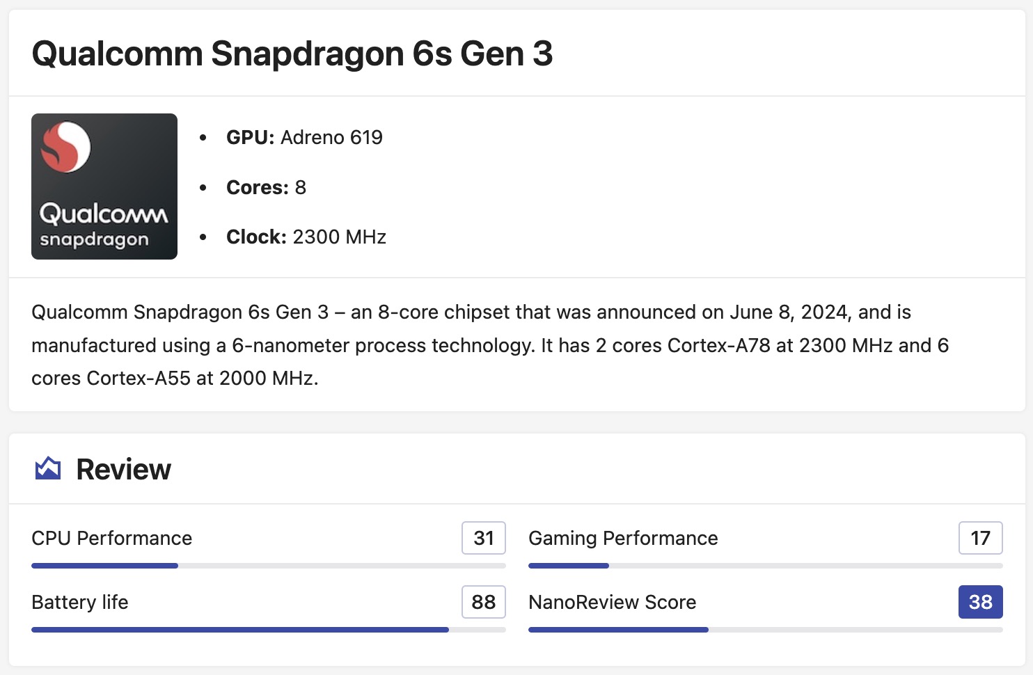 퀄컴은 '스냅드래곤 6 Gen 3'가 '스냅드래곤 6 Gen 1'에 비해 CPU 성능이 10% 향상되고, GPU 성능이 30% 이상 향상되며, AI 처리 성능이 20% 이상 개선 되었다고 이야기하고 있습니다.