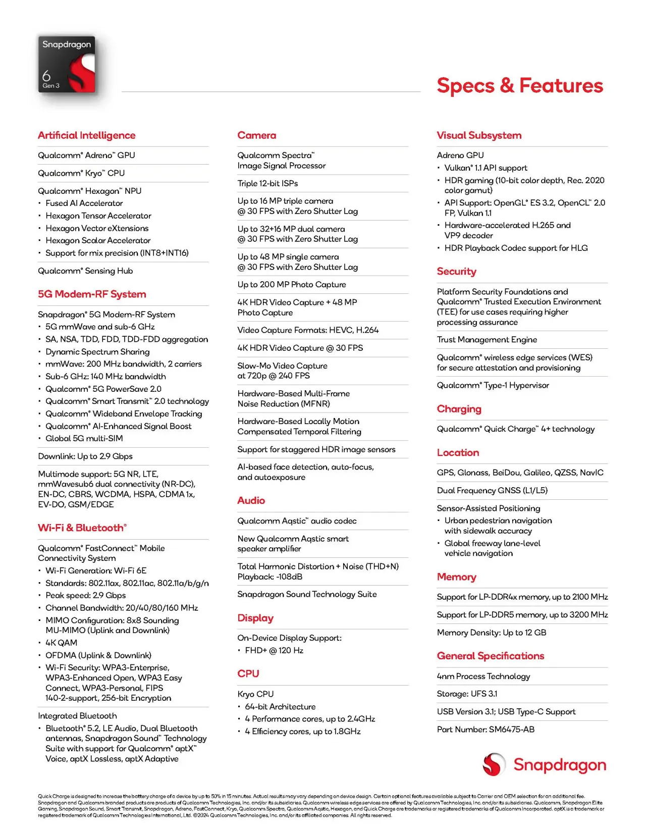 '스냅드래곤 6 Gen 3'는 LPDDR4x 및 LPDDR5 RAM, UFS 3.1 저장 장치를 지원하며 네트워크 연결 옵션도 Wi-Fi 6E, 최대 2.9 Gbps의 속도를 제공하고, Bluetooth 5.2와 USB 3.1을 지원하고 있습니다.