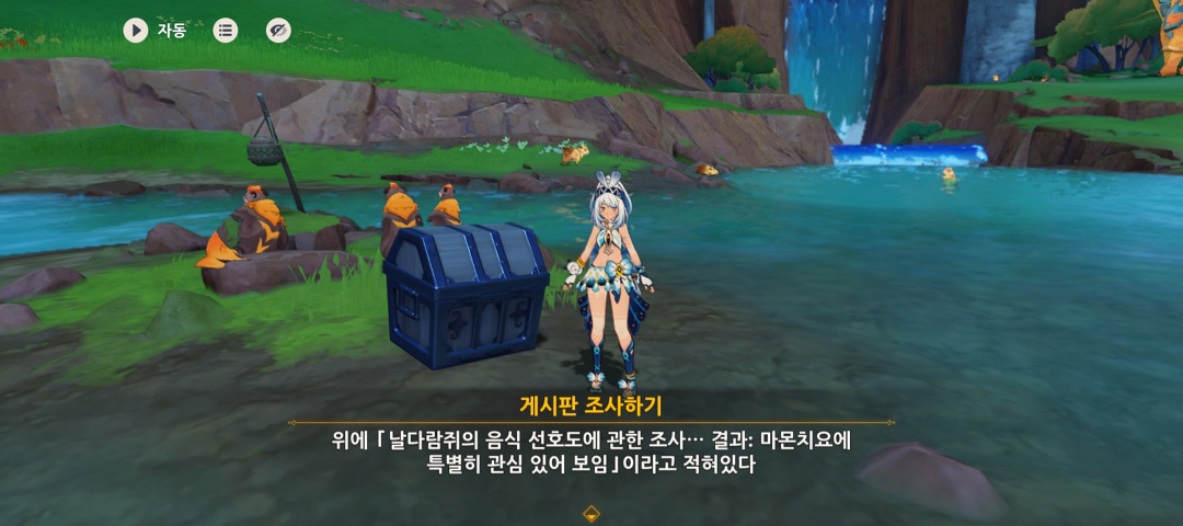 바구니 아래쪽에 게시판이 있는데 상호작용을 하면 날다람쥐 음식 선호도에 관한 조사 어쩌구 하면서 마몬치요에 관심이 있다는 이야기가 나옵니다.